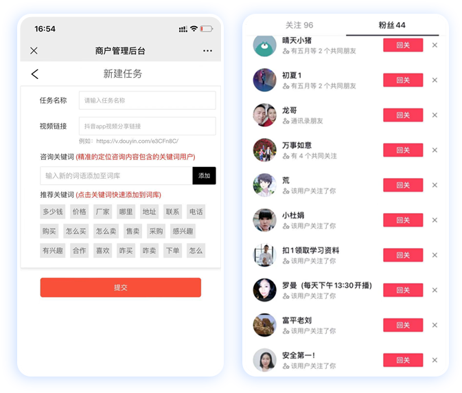 - 系统可依据用户行为、兴趣爱好等多维度数据,精准筛选出目标客户群体,还能通过关键词设置,监控同行视频评论区等,截流同行的意向客户,将对产品或服务有需求、有兴趣的潜在客户直接呈现在使用者面前,提高获客的精准度和效率.